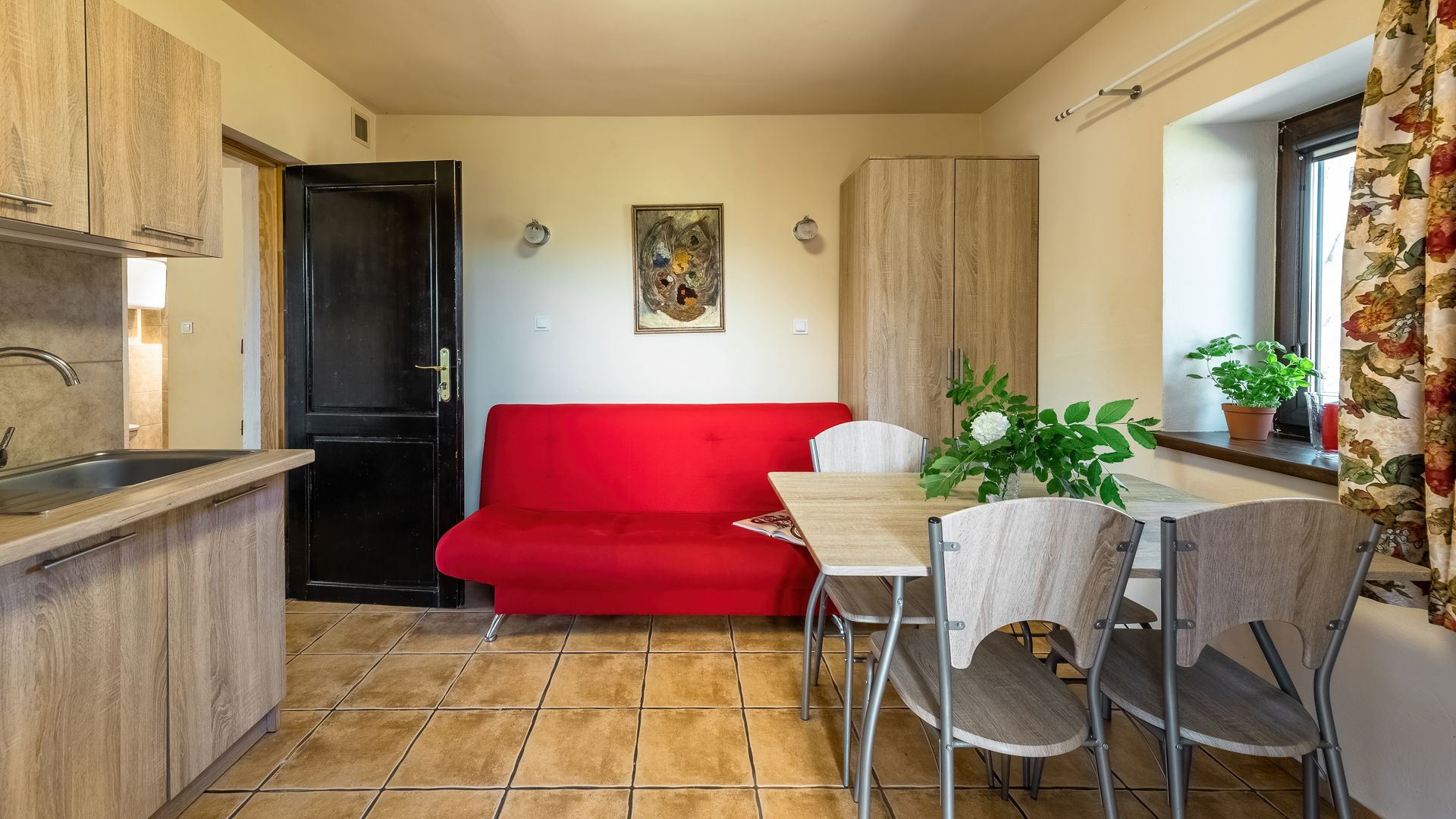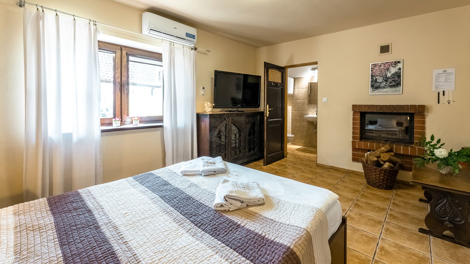 Apartament dla 3-4 osób z kominkiem w sypialni i widokiem na jezioro Niegocin. W pokoju dziennym znajduje się sofa z funkcją spania.
