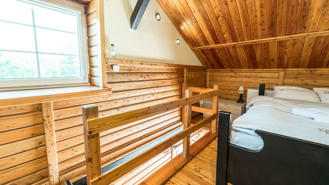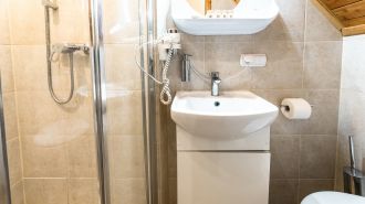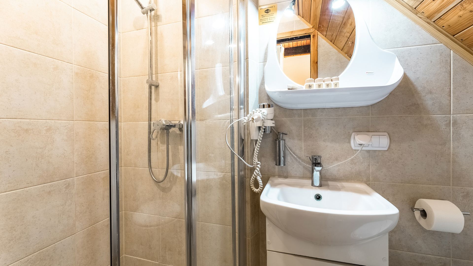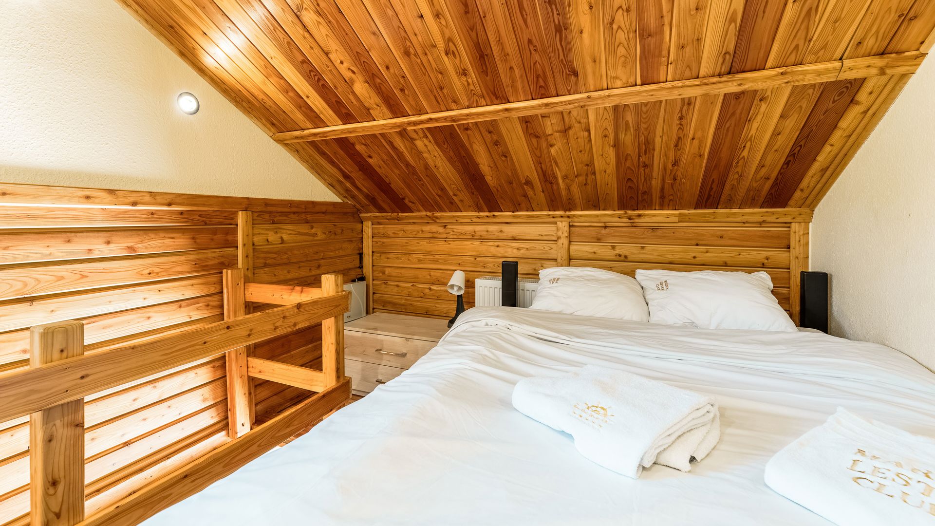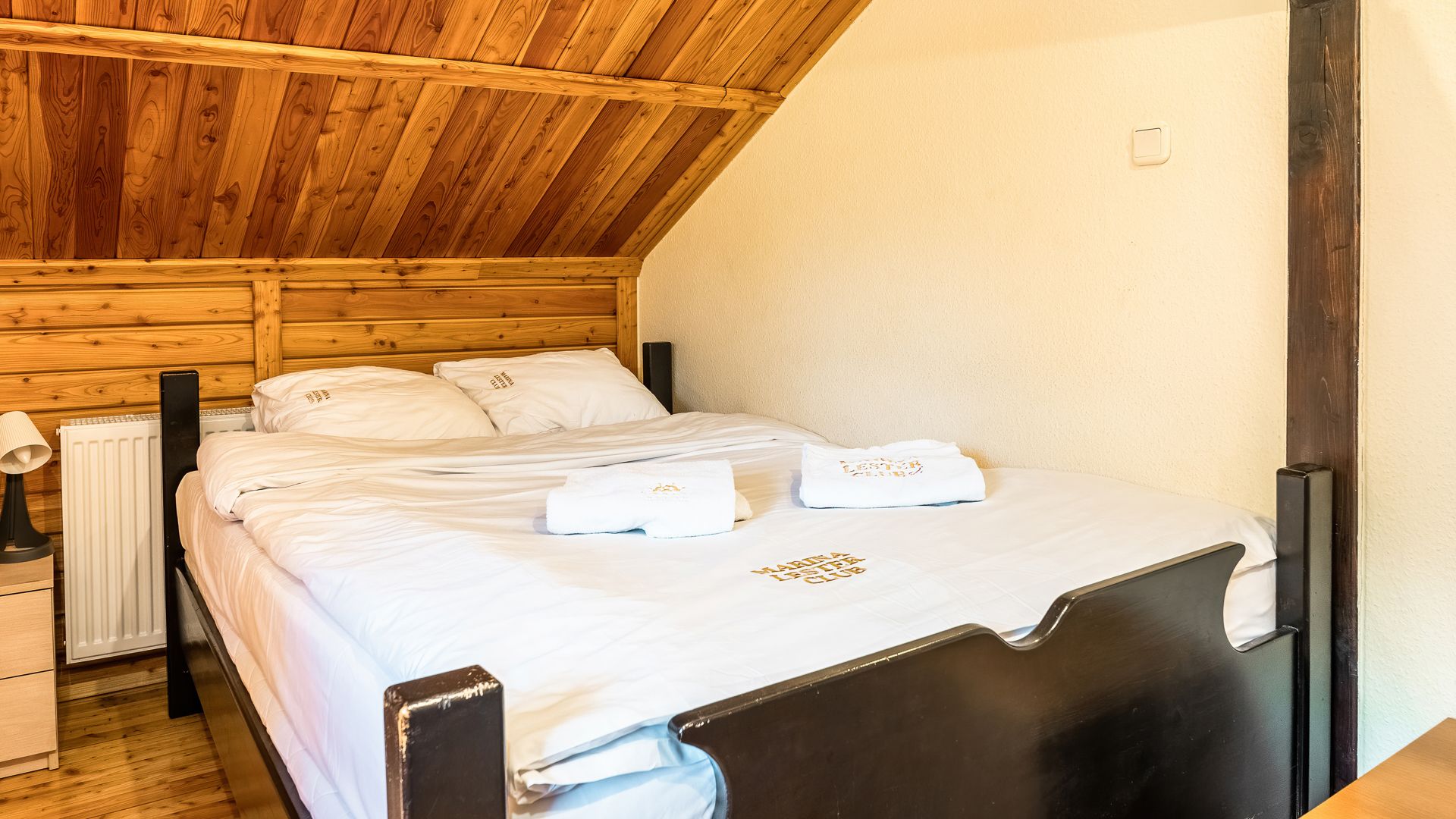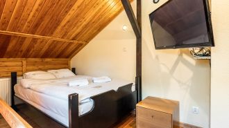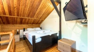 Pokój na piętrze z podwójnym łóżkiem oraz sofą z funkcją spania, a także dwoma balkonami. Udogodnienia Łazienka z kabiną...