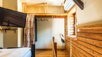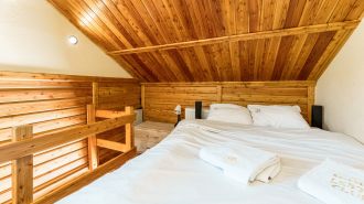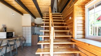 Dwupoziomowy pokój dla czterech osób. Na parterze znajduje się łóżko pojedyncze, kącik kuchenny i łazienka. Na piętrze jest sypialnia z...
