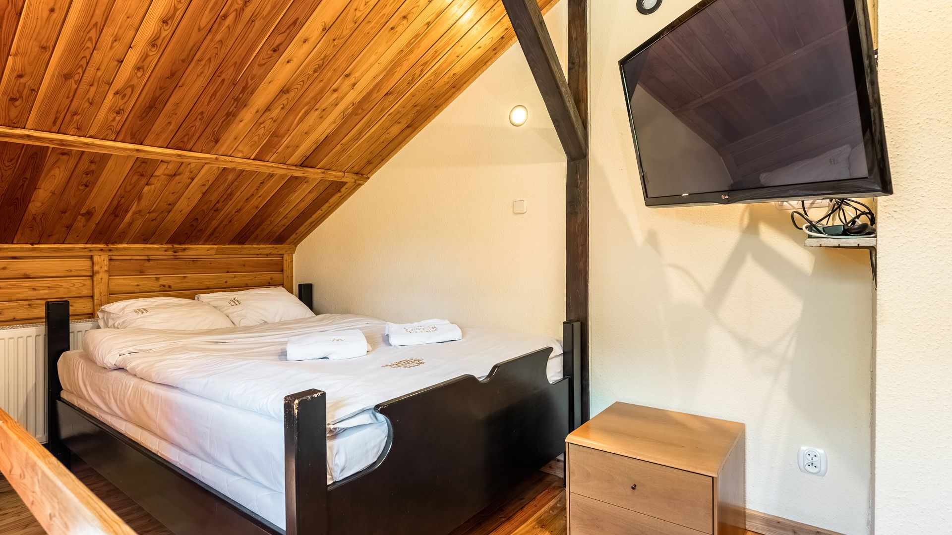 Pokój z podwójnym łóżkiem oraz sofą z funkcją spania, a także balkon. Pokój znajduje się na piętrze. Udogodnienia ...
