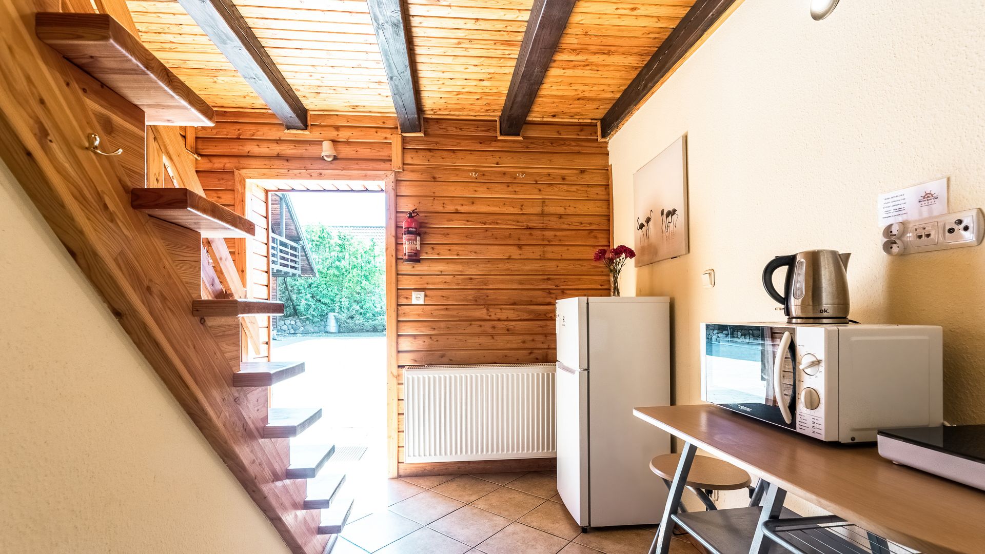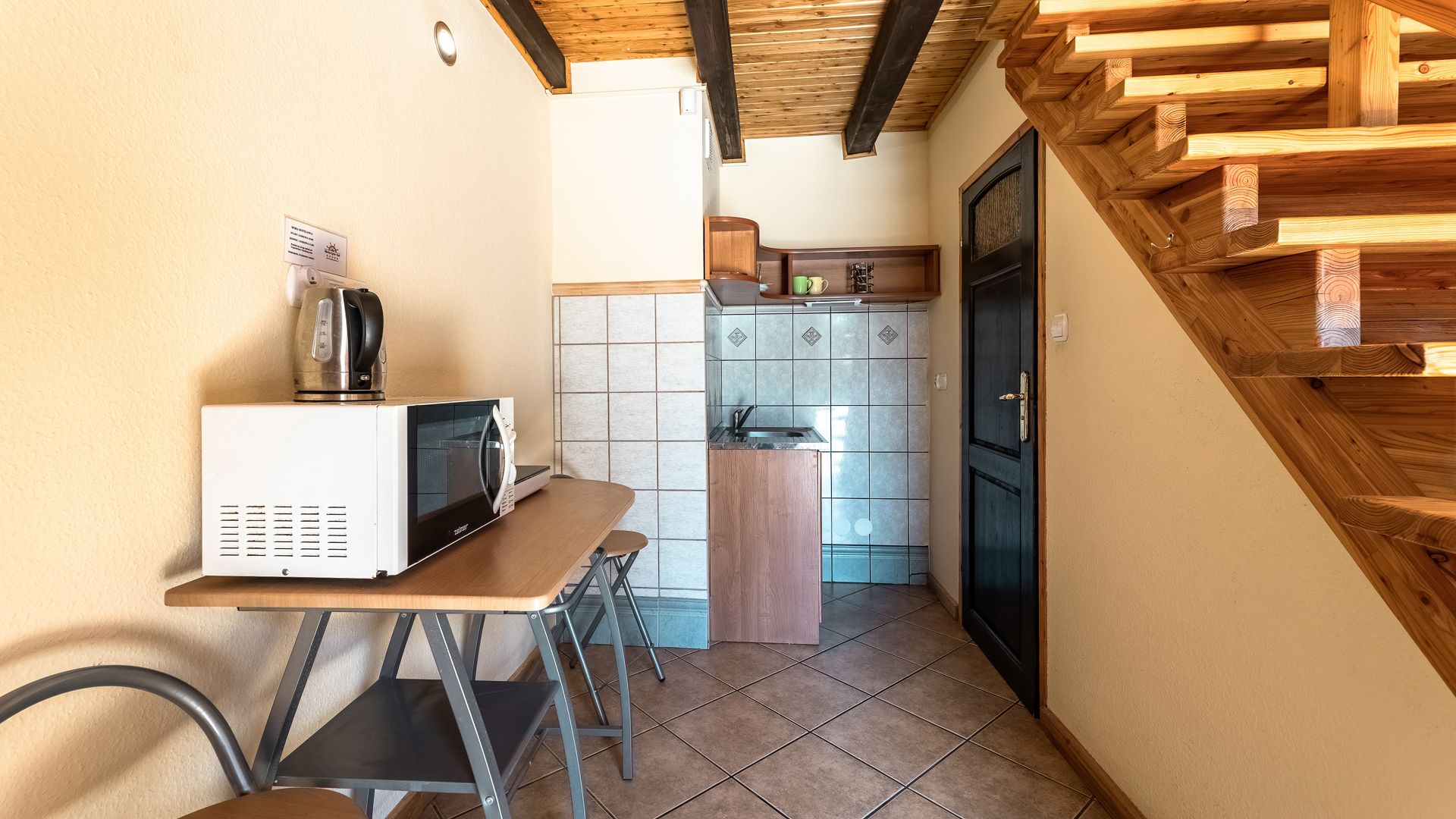 Dwupoziomowy apartament dla dwóch osób z kącikiem kuchennym na umieszczonym na parterze oraz sypialnią z podwójnym łóżkiem na piętrze.