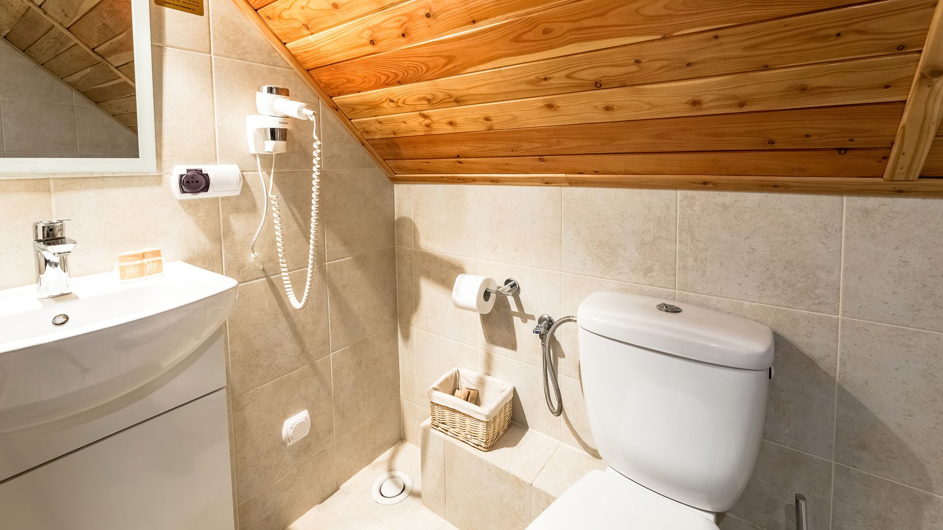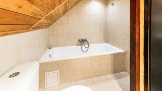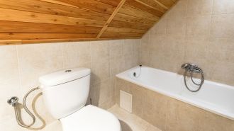 Pokój na piętrze z podwójnym łóżkiem oraz sofą z funkcją spania, a także dwoma balkonami. Udogodnienia Łazienka z kabiną...
